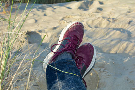 Resting between the dunes, lying on the beach with sneakers, on the North Sea coast in the Netherlands