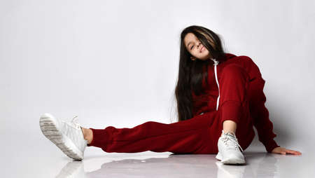 Trendy caucasian preteen girl model in fashion eyeglasses and tracksuit
