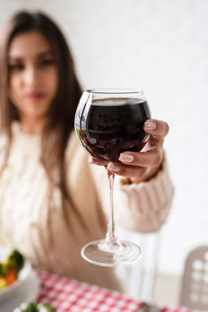 Woman hand holding a wine glass with red wine
