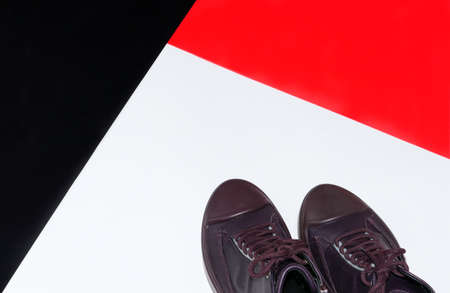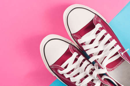 Red Sneakers lie on a multi colored pastel surface. Top view. Retro fashion. Close up