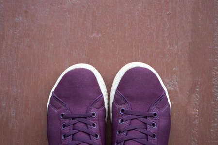 Purple sneakers from an aerial view on concrete pavement, Top view.