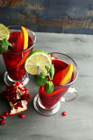 Pomegranate drink in glasses with mint and slices of orange and lime on color wooden background