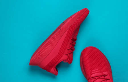 Stylish red sports shoes for running on blue background. Top view