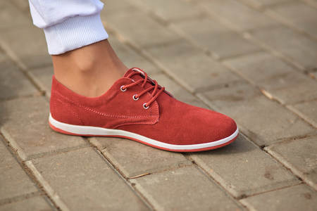 Closeup of sports children sneakers on red background