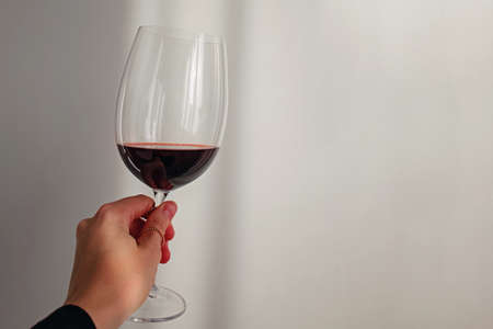 Woman's hand holding a glass of red wine over the white wall. Wine tasting