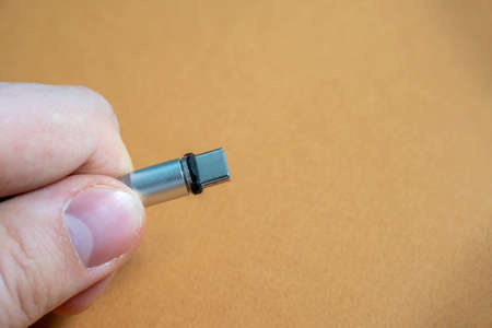 The usb type C cable is collapsible with a magnetic attachment in your hand on a brown background. Copy space