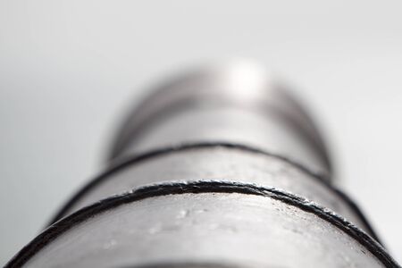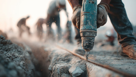 A close-up view depicts a worker using a drill to bore into a metal rod on a construction site. The image displays a shallow depth of field, with the tool in sharp focus. The scene, shot in natural light, shows other workers and dust in the background. It is suitable for illustrating construction, engineering, or industrial themes.