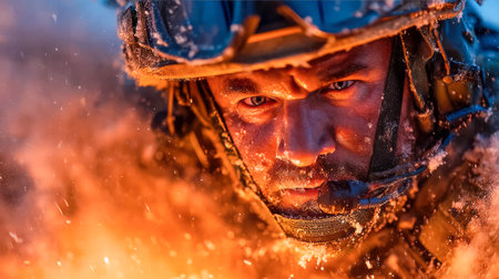 Intense close-up of a firefighter's face covered in sweat and ash, surrounded by flames and snow.