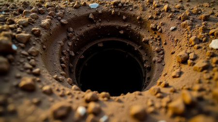 A close-up view of a rocky surface with a large dark hole in the center surrounded by a variety of rock formations and textures