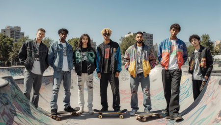 Group of seven young people pose with skateboards in an urban, sunny skatepark scene