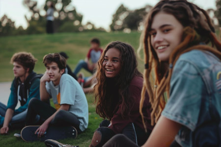 Group of teenagers in a park sitting on the ground. Engaging in a deep conversation while sitting on the grass. Generative AI