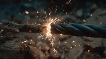 This image captures the intense moment of a steel cable being cut, with vibrant sparks illuminating the dark workshop. The close-up showcases the raw energy of industrial work.