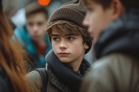 Young boy in beanie standing in front of group of people, looking confident and determined