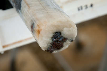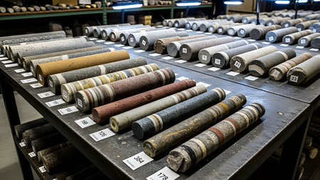 Core samples of mineral rock lined up with tags for analysis in engineering study