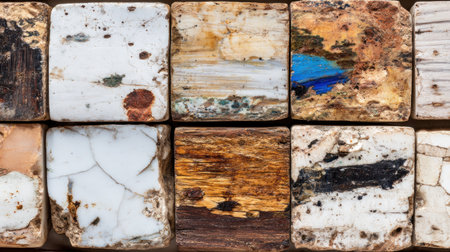 Macro photograph showcasing a grid arrangement of twelve roughly cut or polished square blocks. These blocks exhibit diverse natural materials, including various tones of petrified wood displaying strong grain lines and several pieces of lighter, fractured mineral or stone, one featuring a striking inclusion of vibrant blue material. The overall impression is one of geological variety and natural artistry presented in small, uniform shapes.