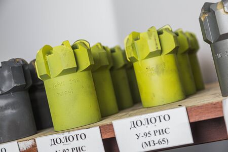 Brand new light green drill bits on shelving in stock. Oil equipment for drilling rig operation on oil platform in oil and gas industry. Written: drill bits