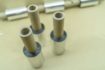 Aluminum billet butt end on shavings from miling machine. Super macro photography shot. Top view industrial closeup photo. Photo of metal rod on swirly aluminum shavings. Industrial technological workshop. Technology concept background.