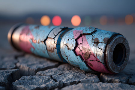 A vividly painted, cracked pipe rests on dry, cracked earth, symbolizing decay and resilience. the background features blurred, colorful bokeh lights, adding a surreal atmosphere, perfect for industrial or environmental themes. Generative AI