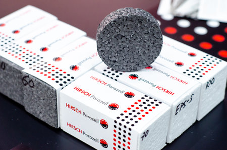 Kyiv, Ukraine - March 17, 2021: HIRSCH Porozell exhibition stand. HIRSCH Porozell supply tailored products for the construction, electrical, food, pharmaceutical, and packaging industries.
