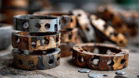 A detailed close-up image featuring assorted metal gaskets and rings highlighting their weathered surfaces and unique textures in a rustic industrial setting.