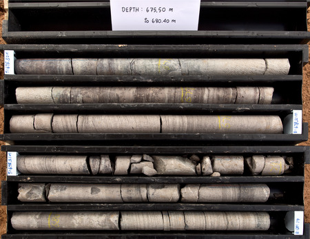 Core samples stored in a box. Geological exploration studies.