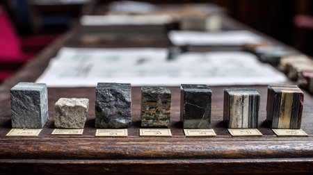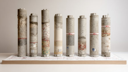 A meticulously arranged collection of concrete core samples showcases various textures and stratifications, capturing the essence of geological research and material analysis.