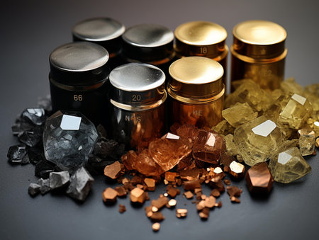 Various raw ore gemstones or rocks on black background, mining and geology, mineralogy