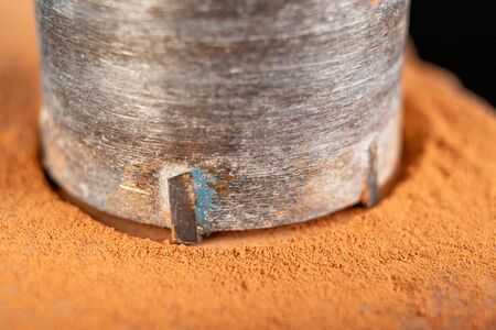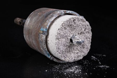 Steel large drill for drilling holes in concrete. Hole saw used to make holes for electrical boxes. Dark background.