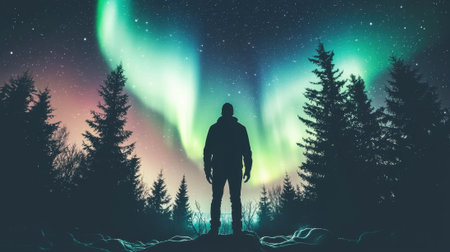 In a tranquil landscape, a lone individual stands still among towering trees as vibrant northern lights dance across the night sky. The colorful display enchants the serene atmosphere.