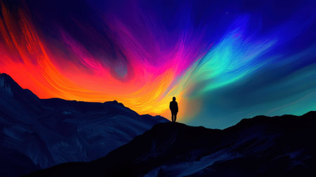 Striking colors of green, purple, and orange swirl across the night sky, enveloping a solitary figure standing on a mountain ridge. The scene conveys tranquility and wonder.