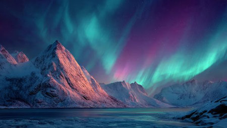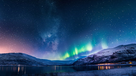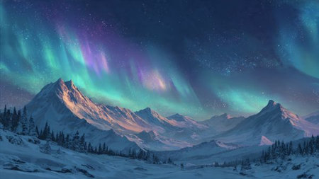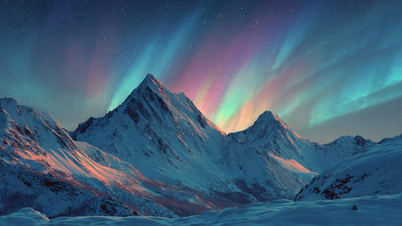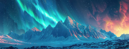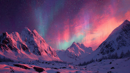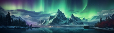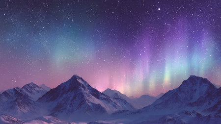 Majestic mountains under the vibrant Northern Lights with a starry sky background showcasing vivid colors