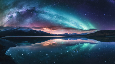 A breathtaking panorama of the Milky Way galaxy and the aurora borealis, with a calm lake reflecting the celestial light.