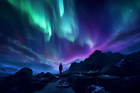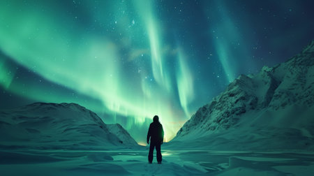 Person standing under the northern lights with snowy mountains in the background. Perfect for winter and adventure themes