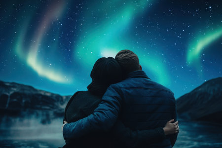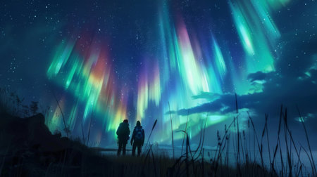 An AI generated illustration of a young couple admiring the breathtaking aurora lights in the night sky