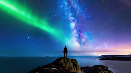 Aurora borealis in the night sky. Northern lights. Man standing on rock.