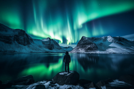 A hiker standing on a rock admiring beautiful Northern Lights, Aurora borealis over the mountain lake.