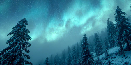 Discover the enchanting beauty of the northern lights illuminating a snowy pine forest, creating a breathtaking scene under a star-filled night sky.