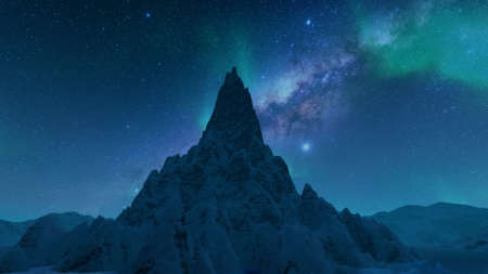 Northern lights in the night sky over snowy mountains. 3d rendering