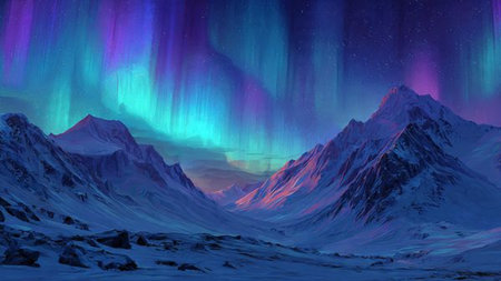 Magical winter panorama featuring glowing auroras above icy peaks.