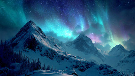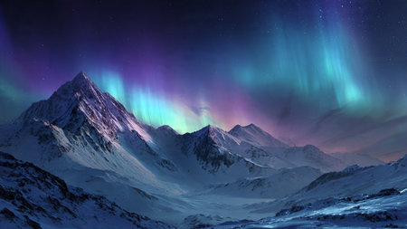 Stunning aurora borealis over a snowy mountain range under a starry sky