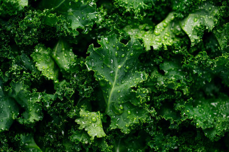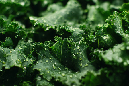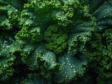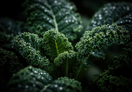 Dark green curly kale leaves covered in sparkling dew drops, captured in a dramatic macro photograph. emphasizes freshness, texture, and healthy organic vegetable concepts.