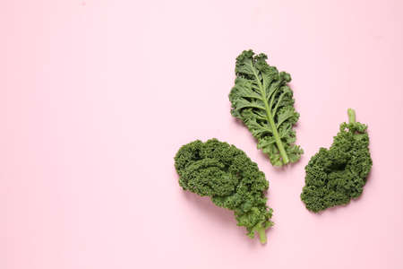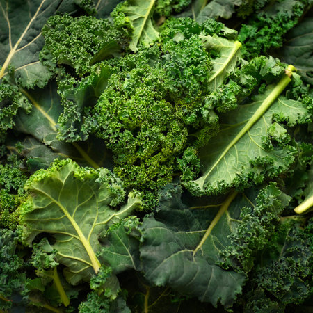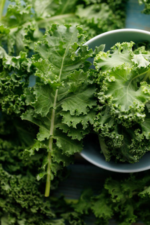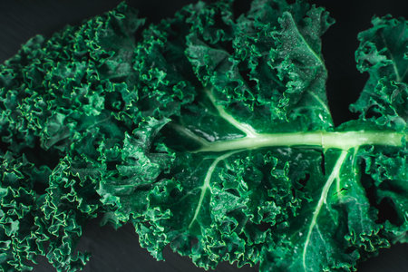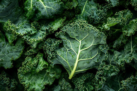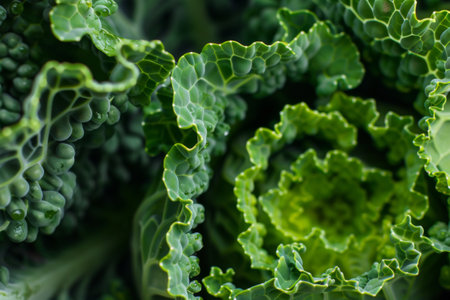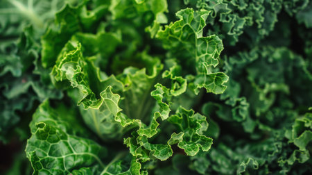 Detail of fresh, green curly kale leaves showing the texture of abstract natural pattern. Ideal for healthy eating, vegan, and organic food concepts. Top-down view shot.