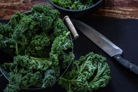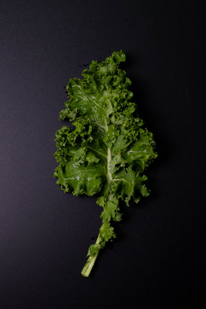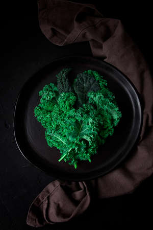 Food background, on a black table, top view, Fresh Kale leaves, close-up, vertical , no people, toned. selective focus,