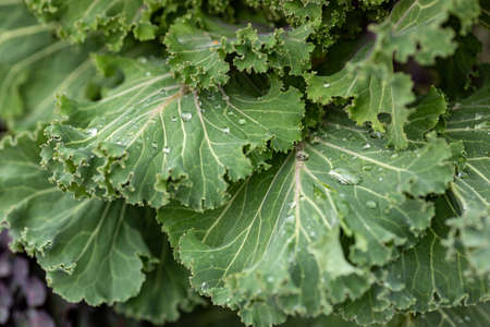 Large group of fresh green leaves of kale or leaf cabbage in an organic garden, with small water drops in a rainy summer day, beautiful outdoor monochrome background photographed with soft focus