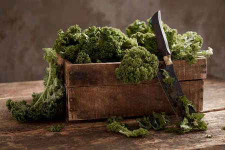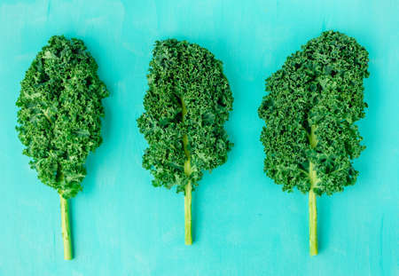 Fresh raw green superfood kale curly cabbage leaves on wooden background
