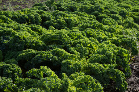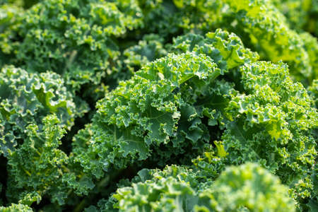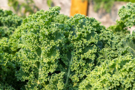 Close up of green curly fresh kale leaves growing in vegetable garden.