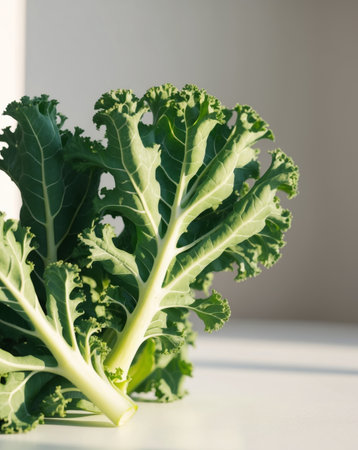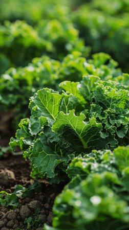 Close-up view of fresh green kale leaves illuminated by sunlight in an organic farm. This image emphasizes health, nutrition, and vibrant nature ideal for food-related themes.
