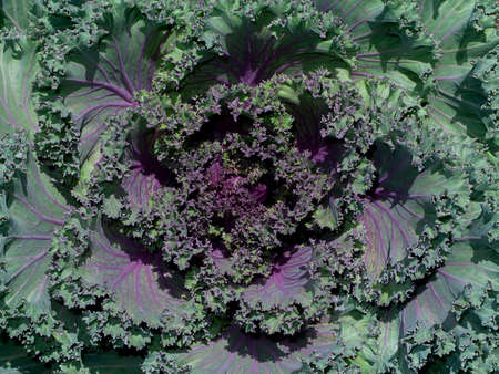 Top view of purple-green decorative cabbage looking like a big carved flower. Deep dark colors. Natural decoration of the landscape or garden.