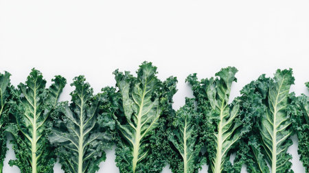A close-up of fresh leafy greens on a plain background with ample space for text.