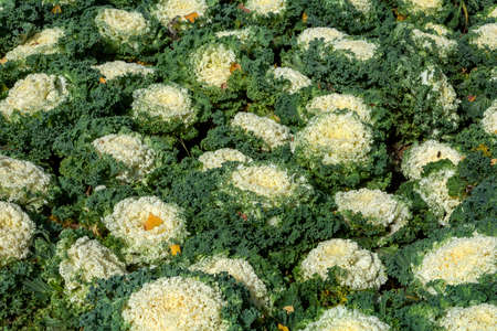 Close up of decorative cabbage, ornamental cabbage plants. Background of green decorative cabbage. Nature pattern. Organic texture. Fresh Cabbage